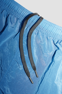 TRUE TRIBE's striking metallic blue swim shorts feature a regular fit with a straight hem, mid-thigh length, and an inner breathable lining for added support. Handcrafted from specially treated paper nylon sourced in Italy, they offer a wrinkled texturised fabric.