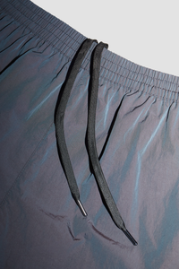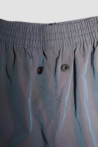 Iridescent Blue classic swim shorts. Designed with a regular fit, straight hem, mid-thigh leg, and inner breathable lining for comfort and support. Crafted from quick-drying Polychromatic fabric made of Econyl®️, a nylon fiber repurposed from landfill and ocean waste.
