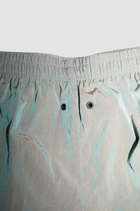 TRUE TRIBE’s iconic moon royal shorts featured in a metallic grey with green hues. Designed with an active fit, rounded side slits for optimal movement, and an inner lining for support. Constructed from quick-drying iridescent paper nylon, made of Econyl®️, an infinitely recyclable nylon fiber repurposed from landfill and ocean waste.