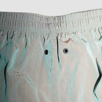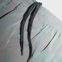 Moon royal classic swim shorts featured in a metallic grey with green hues. Designed with a regular fit, straight hem, mid-thigh leg, and inner breathable lining for comfort and support. Crafted from quick-drying Polychromatic fabric made of Econyl®️, a nylon fiber repurposed from landfill and ocean waste.
