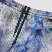 Blue acid tie-dye wash over metallic print swim shorts. Designed with an active fit, rounded side slits for optimal movement, and an inner lining for support. Crafted from quick-drying, soft nylon made of Econyl®️, an infinitely recyclable nylon fiber repurposed from landfill and ocean waste.